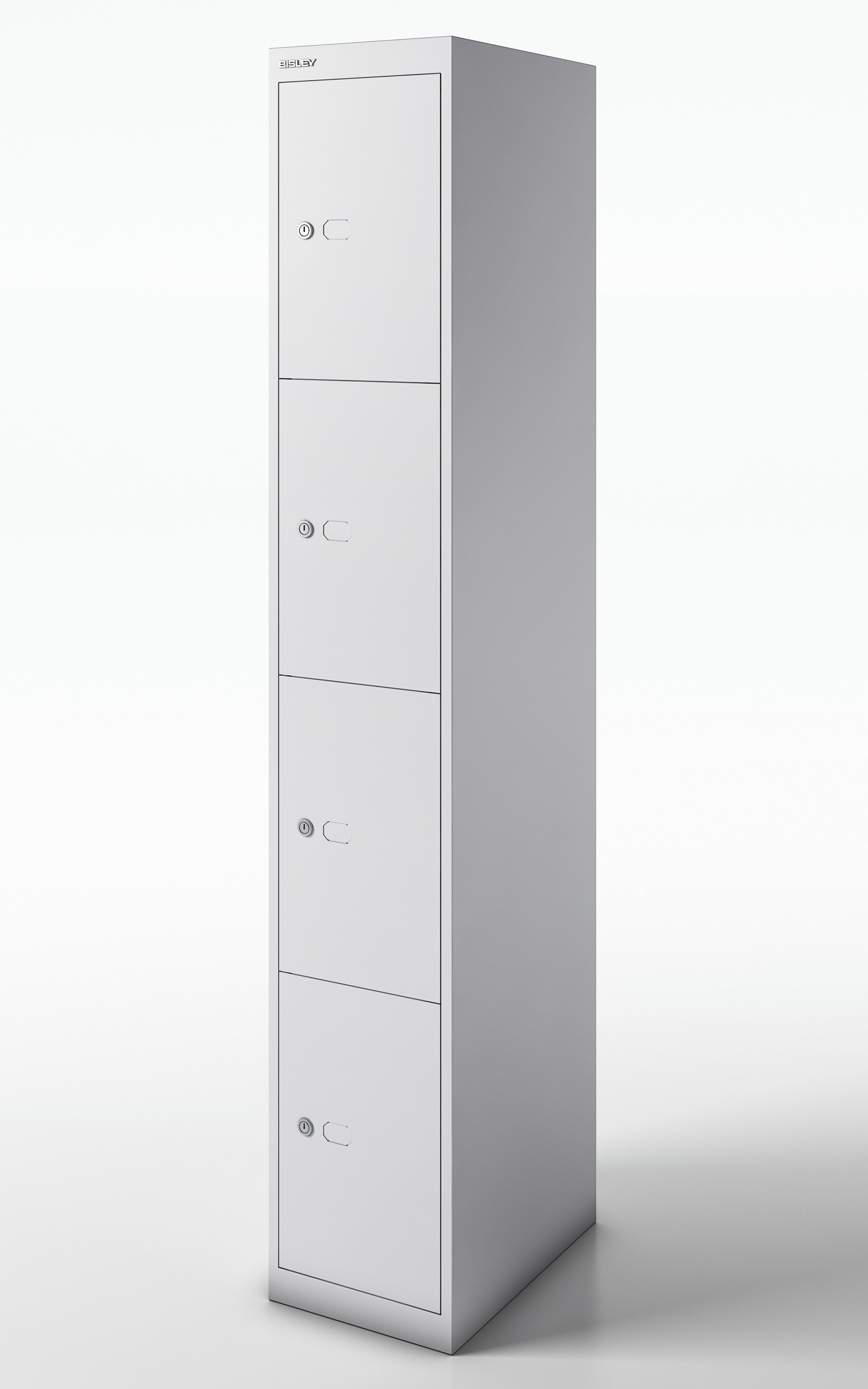 Die Türen der vier Fächer sind mit einem Etikettenhalter und einem Zylinderschloss ausgestattet.