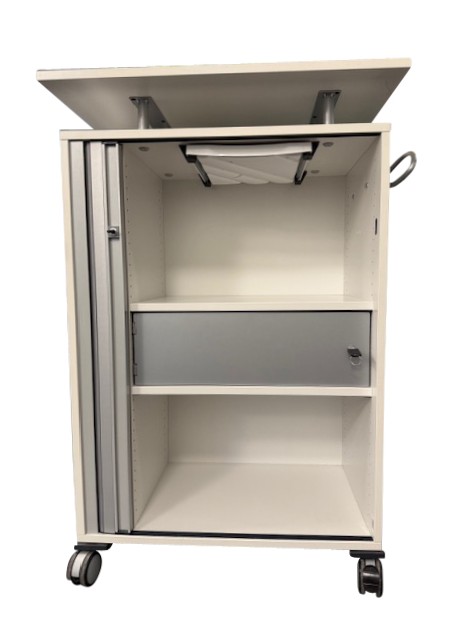 B 1800 x T 800 x H 630 - 850 mmPlatte: Melamin weiß - neuGestell: Aluminiumfarben - Gestell höheneinstellbar von 630 - 850 mm - Vorziehbare Arbeitsplatte - Kabelkanal unter der Platte - ohne CPU - Halterung - - optional mit bis zu drei Kabelauslässen (Ø 80 mm - aluminiufmarben) +++Gebrauchtmöbel+++ Die Tischplatte ist neu - das Gestell ist gebraucht mit minimalen Gebrauchsspuren