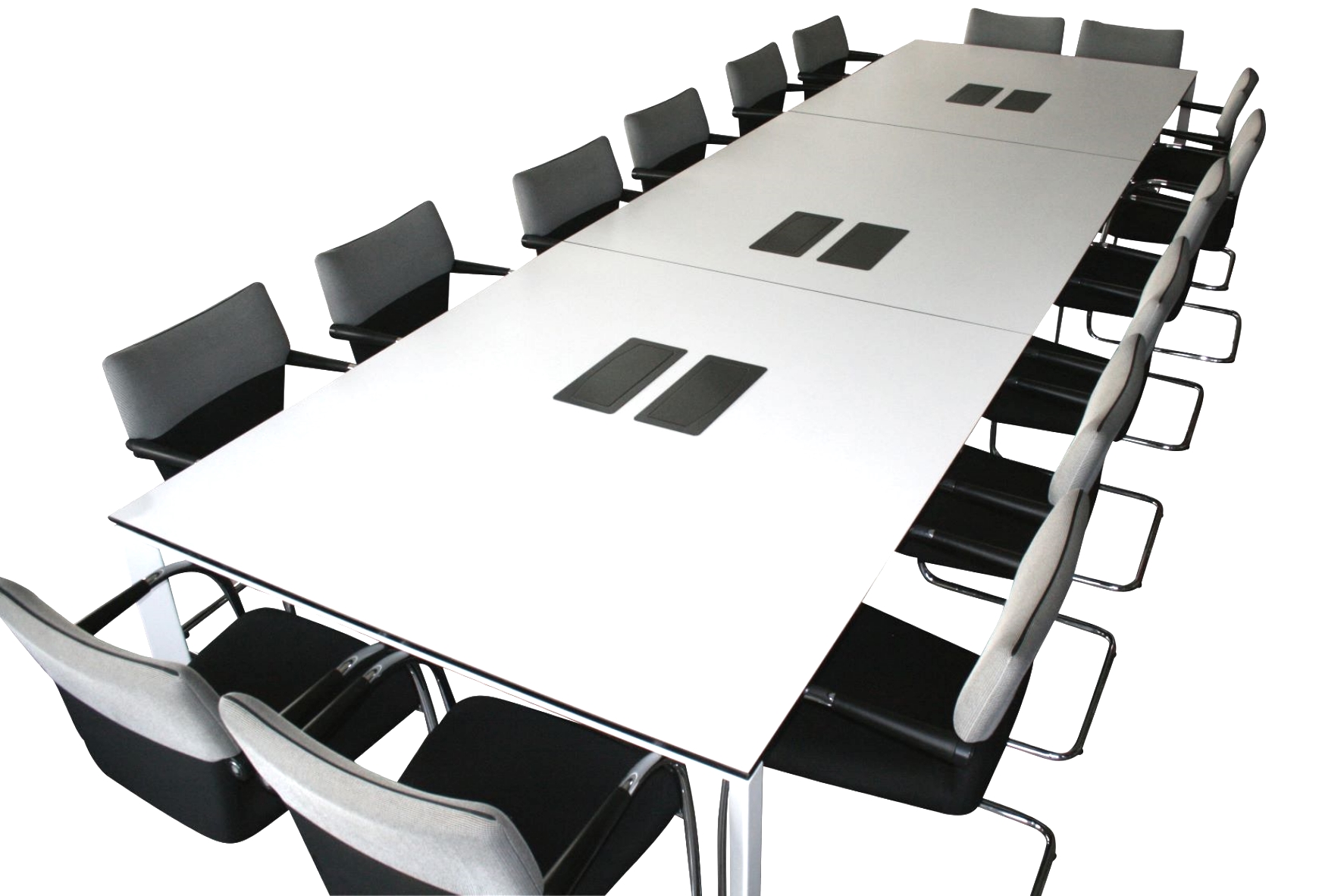 Jede Tischplatte beinhaltet zwei aufklappbare, schwarze Bedarfssteckdosen, jedoch ohne Kabel!